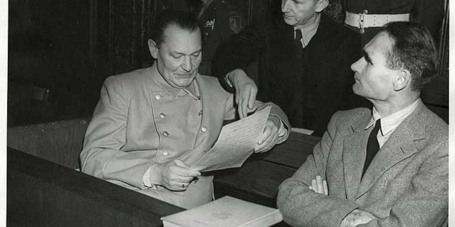 Rudolf Heß (rechts) mit den NS-Führern Hermann Göring (links) und Karl Dönitz (mitte) als Angeklagte im Nürnberger Kriegsverbrecher-Prozeß.