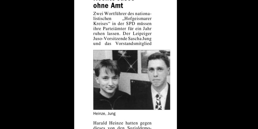 Der SPD-Bundesvorstand verhält sich gegenüber seinen deutsch-nationalistischen Sprößlingen noch sehr verhalten. Ein Parteiausschluß wurde bisher abgelehnt. Die einzigen, die sich jetzt zu einer Initiative durchringen konnten, sind die Ortsverbände in Aachen. Sie haben ein Parteiordnungsverfahren gegen führende Mitglieder des »Hofgeismarer Kreis« beantragt. Aus der SPD ausgeschlossen werden sollen nach Beschlüssen die »Hofgeismarer« Sascha Jung (Leipziger Juso-Vorsitzender), Heiko Oßwald (Schatzmeister), Harald Heinze (Leipziger Kontaktstelle), sowie beiden stellvertretenden Vorsitzenden Markus Glaubbig und Daniel Senf. Das angestrebte Parteiausschlußverfahren attestiert ihnen eine „im Kern mit den SPD-Grundsätzen zu vereinbarende Grundeinstellung“ und verhängt lediglich für Sascha Jung und Harald Heinz ein einjähriges Funktionsverbot.