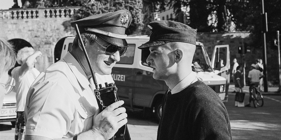Der FAP-Funktionär Thorsten Heise bespricht sich mit der Polizei. Diese ignoriert dabei den SS-Totenkopf an seiner Mütze.
