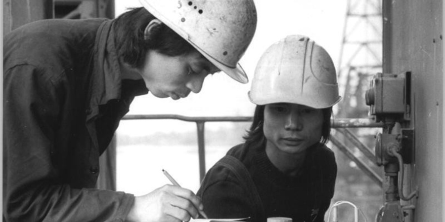 Vietnamesische Vertragsarbeiter waren 1982 im Tagebau Jänschwalde (DDR) als Elektriker tätig.