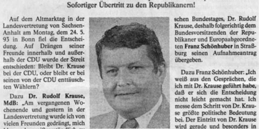 Erste positive Ergebnisse (Risse im Informationsfluß zwischen Vorstand und Basis) sind schon erkennbar. Der aus der Partei 1993 ausgetretene ehemalige Landesvorsitzende von Sachsen-Anhalt Ekkehard Birkholz beklagte den autoritären Führungsstil der „Ein-Mann-Partei“. Bei den am 12. Juni 1994 stattgefundenen Wahlen der Abgeordneten des europäischen Parlaments traten zehn REP-Kandidaten auf einer gemeinsamen Liste für alle Länder an. Aus Sachsen-Anhalt kandidierten Rudolf Krause aus Bonese auf Listenplatz zwei und Marita Schwarze aus Jessen auf Listenplatz zehn. Die REP haben in Sachsen-Anhalt einen Landesverband und mehrere Kreisverbände aufgebaut. Als Landesvorsitzender fungierte zunächst Ekkehard Birkholz aus Frose (Landkreis Aschersleben). Nach dessen Rücktritt übernahm die Bundesschriftführerin Martina Rosenberger (Bayern) kommissarisch. Durch Partei-Übertritte sind Rudolf Krause (Bonese) sowie der in der Quedlinburger Stadtverordnetenversammlung und im Kreistag vertretene Heinz-Otto Hohmann zu REP-Mandatsträger geworden.) Magdeburger AntifaschistInnen hoffen, daß es ihnen auch in Zukunft gelingt, die Arbeit der ultra-rechten Parteien zu erschweren und Treffen in Magdeburg zu einem Risiko für solche Organisationen zu machen.