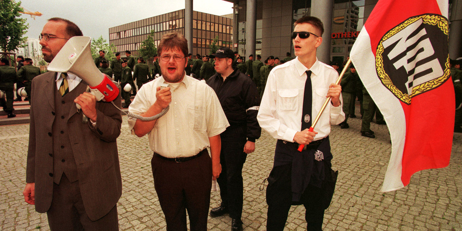 Der unerwünschte JN-Kader Andreas Storr als Megaphon-Halter und der JN-Chef Holger Apfel als Redner.