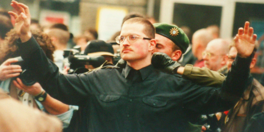 Der FVB-Aktivist Jürgen B. wird bei einer Neonazi-Demonstration durchsucht.