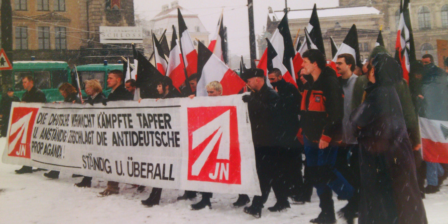 Die NPD hat in Sachsen mit gut 1.000 Mitgliedern nicht nur den stärksten Landesverband. Zu allem Überfluß ist Dresden auch noch neuer Sitz der Bundesgeschäftstelle der NPD-Jugendorganisation unter Leitung von Oliver Händel (ehem. Köln) und Katharina Handschuh (JN-Bundesmädelbeauftragte). Somit verwunderte es kaum, daß am 24. Januar 1998 etwa 1.200 Neofaschisten dem Ruf der NPD gefolgt waren, um durch Dresden zu marschieren. Der schon lange geplante Aufmarsch richtete sich nicht nur gegen die Wehrmachtsausstellung, sondern war gleichzeitig auch der offizielle Auftakt der NPD für das Wahljahr 1998.