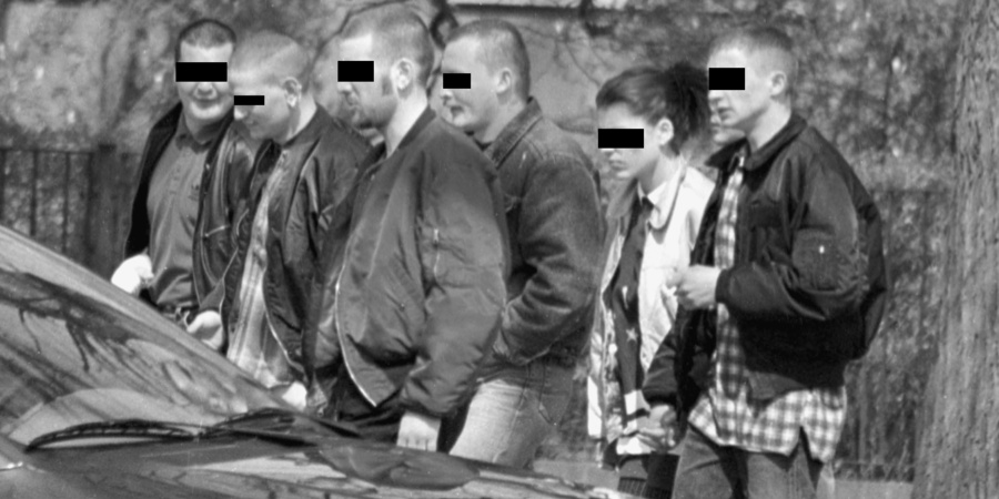Prozeßbesucher und Angeklagte aus Königs Wusterhausen am Rande des Prozesses gegen Eric O. (2.v.l.) und Maik P. (1.v.r.), die 1991 mit einem Kleinkalibergewehr in Zeesen auf Antifas geschossen hatten. Sieben Jahre nach der Tat wurden beide im Dezember 1997 wegen versuchten Totschlags zu Bewährungsstrafen verurteilt.