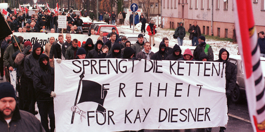 Inhaftierte Neonazis werden von der Neonazi-Bewegung unterstützt. Hier ein Transparent für den Neonazi-Mörder Kay Diesner im Dezember 1998 auf einer NPD-Demonstration in Berlin.