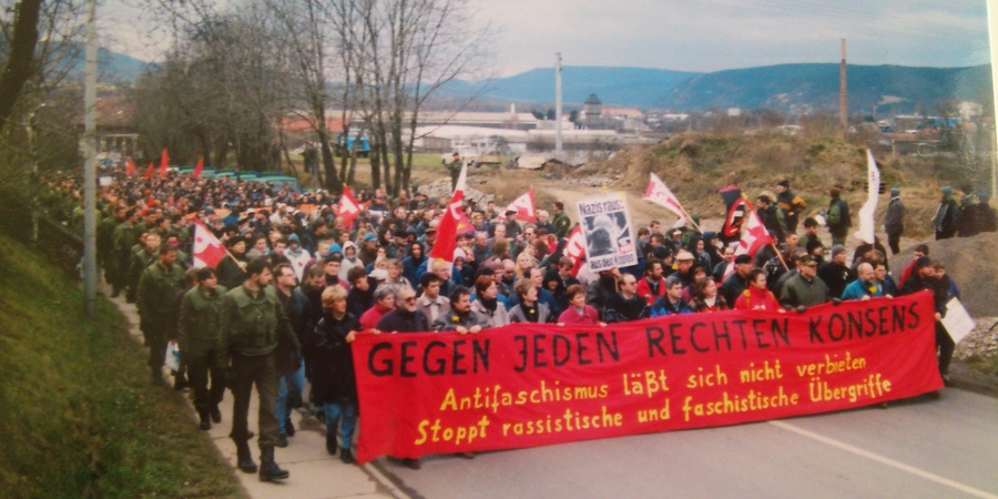 Vor über einem Jahr, am 11. Oktober 1997, wurden, bei dem ersten Versuch, eine antifaschistische Großdemonstration in Saalfeld zu machen, fast 400 AntifaschistInnen festgenommen und teilweise mehr als 48 Stunden in Unterbindungsgewahrsam festgehalten (s. AIB Nr. 41). Einige, von den polizeilichen und gerichtlichen Willkürmaßnahmen betroffene AntifaschistInnen sind im Nachhinein gegen den Unterbindungsgewahrsam gerichtlich vorgegangen. Ende Oktober 1998 hat das Thüringer Oberlandesgericht endlich einer Betroffenen Recht gegeben. Konkret stellten die Richter fest, daß »die mit Beschluß des Amtsgerichts Rudolstadt vom 12.10.1997 angeordnete Fortdauer der Freiheitsentziehung rechtswidrig war.« (Aktenzeichen der Entscheidung: Az 6 W 243/98). Das Urteil des Oberlandesgerichts beruht zwar »nur« darauf, daß offensichtlich die falschen Richter vor Ort waren. Trotzdem - die Entscheidung steht und damit haben alle diejenigen, welche Widerspruch gegen ihren Unterbindungsgewahrsam eingelegt haben, die Möglichkeit, Haftentschädigung einzufordern. Im Moment laufen noch weitere Klagen, um gegen die Ingewahrsamnahme vom 11.10.1997 vorzugehen. Es ist in jedem Fall sinnvoll, wenn sich die Betroffenen beim "Berliner Ermittlungsausschuß" (EA Berlin) melden und nachfragen, welches weitere Vorgehen jetzt sinnvoll ist. Schließlich sollte es den Gerichten und der Staatskasse von Thüringen so schwer und teuer wie möglich gemacht werden.