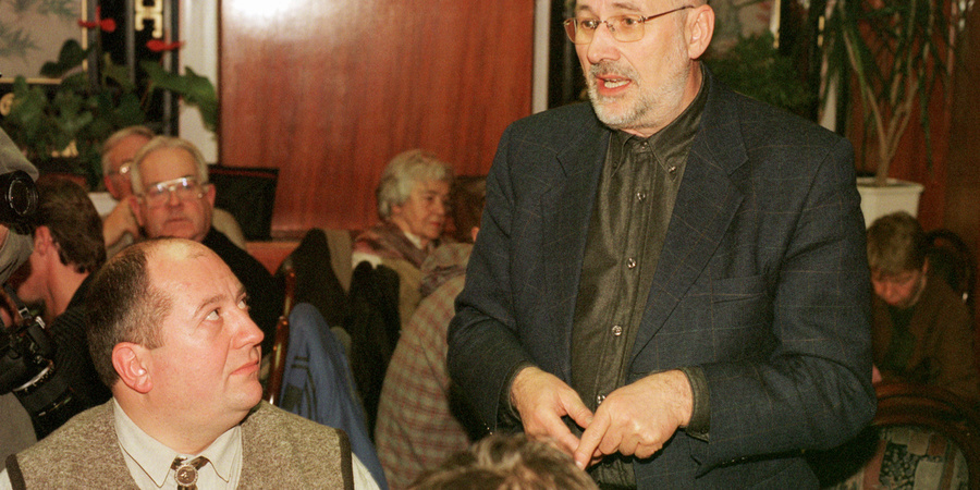 Der frühere Neonazi-Terrorist Peter Naumann (links) 1999 auf einer Veranstaltung mit Horst Mahler (rechts) in Leipzig.