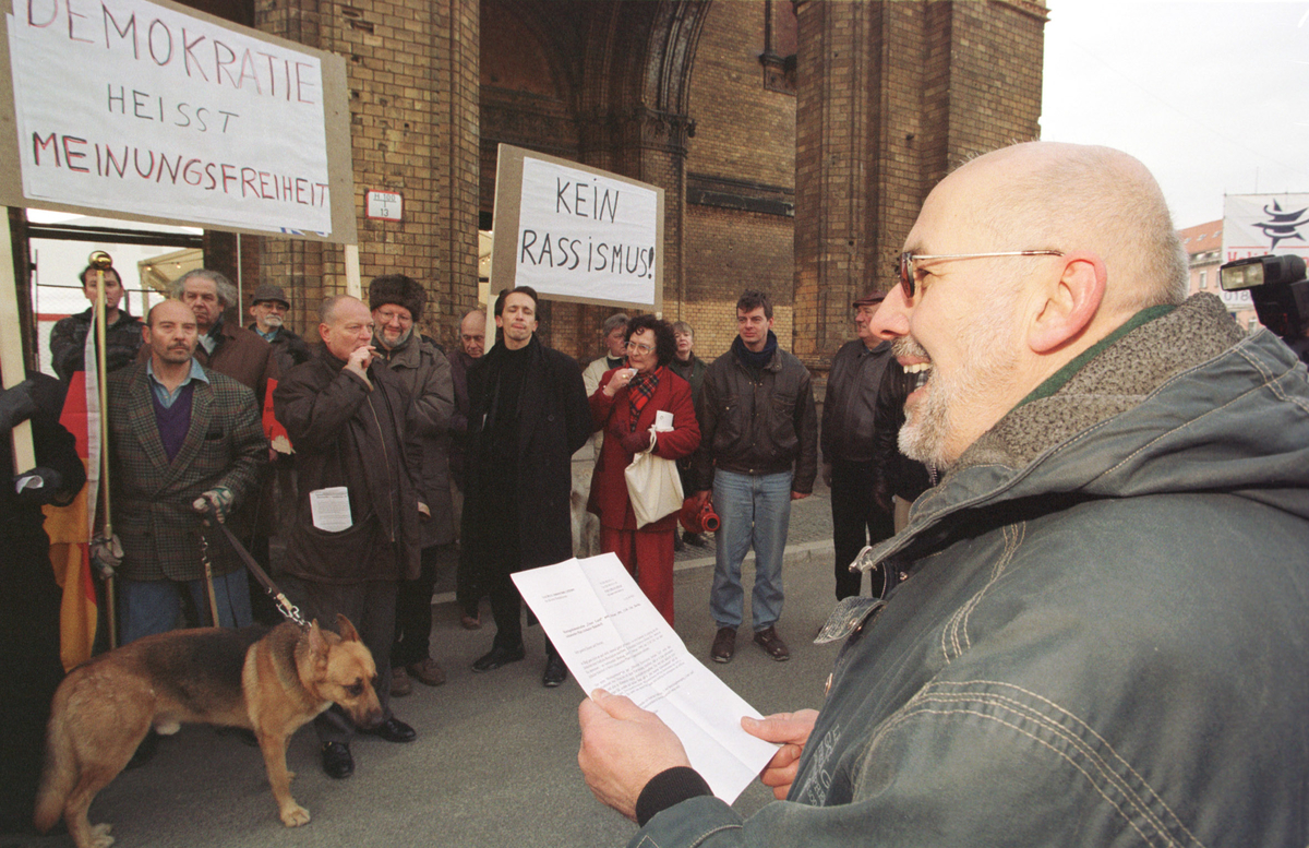 Mit von der Partie waren der Berliner Landesvorsitzende des „Bund Freier Bürger“, Torsten Witt, der BFB-Funktionär Rene Bethage und der Berliner REP-Aktivist Olaf Hempelmann. Die Mini-Rassisten-Demo lief auf dem Bürgersteig bis zur SPD- Bundeszentrale, wo sechs Demonstranten um den BFBler Torsten Witt eindrangen, um Schilder wie »Das deutsche Volk wehrt sich« zu zeigen. Auf der Abschlußkundgebung ermutigte Horst Mahler seine Truppe mit dem Hinweis, daß auch die frühen Montagsdemonstrationen klein angefangen hätten, bevor sie zum »mächtigen Volksstrom« wurden.