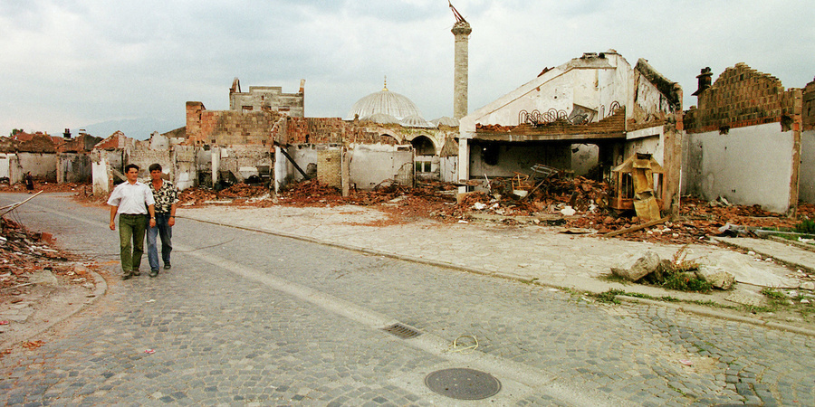 Niedergebrannte Häuser in der Altstadt von Gjakova (Djakovice) in Jugoslawien.