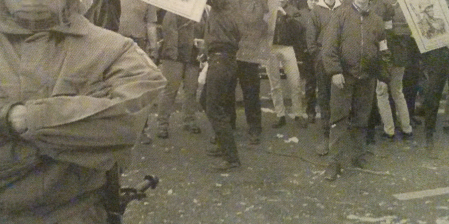 In dem Augenblick, in dem sich der Neonaziaufmarsch in Bewegung setzte, zerstreute sich innerhalb von Sekunden, nicht allzu weit entfernt, die Gegendemonstration. Seit dem Morgen hatten sich an die zweitausend GegendemonstrantInnen, mehrere Kilometer vom Treffpunkt der Neonazis entfernt, in der Kölner Südstadt gesammelt. Nach einem kurzen Kulturprogramm bewegte sich der bunt gemischte Demonstrationszug in Richtung Norden. In kleineren Gruppen und durch schnelles Agieren schafften es die Gegnerinnen des Aufmarsches, die Polizeisperren, die lediglich den direkten Zugang zur geplanten Demoroute der Neonazis versperrten, zu umgehen. So gelang es einem Großteil der GegendemonstrantInnen, sich den Neonazis bis auf ca. 200 Meter zu nähern. Sie scheiterten an der letzten Polizeikette vor der Neonazidemonstration. Als klar war, daß es nicht mehr weiterging, setzten sich viele DemonstrantInnen einfach auf den Boden und blockierten so den geplanten Weg des Neonaziaufmarsches. Von diesem Augenblick ging es für die Neonazis keinen Meter mehr vorwärts.