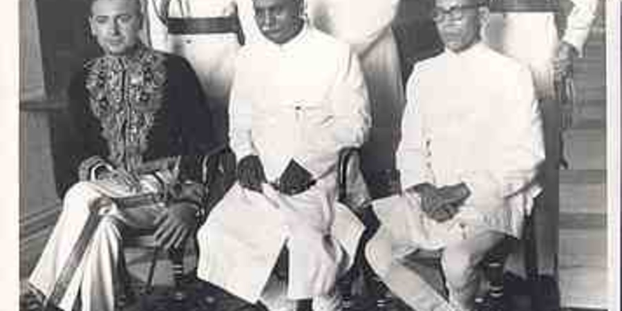 Der spätere rechts-esoterische Schriftsteller Miguel Serrano (links) überreichte 1957 sein Beglaubigungsschreiben als Botschafter in Indien.