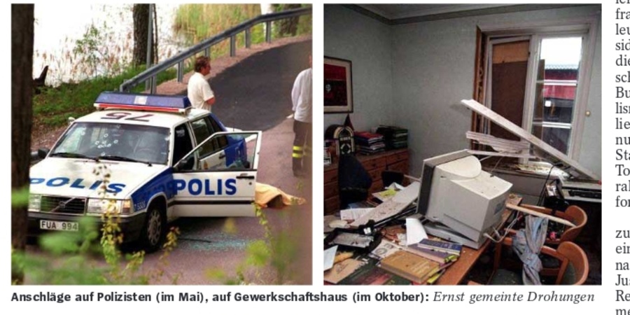 Als Ende Oktober 1999 Gewerkschaften und Parteien zu Demonstrationen gegen die Neonazi Gefahr mobilisierten, explodierte vor dem Gewerkschaftshaus in Gävle eine Bombe. Kurz darauf ging ein Sprengsatz am Haus des Musikers Mikael Wiehe in Malmö hoch. Er war im Vorfeld bedroht worden und hatte dies vergebens bei der Polizei angezeigt.