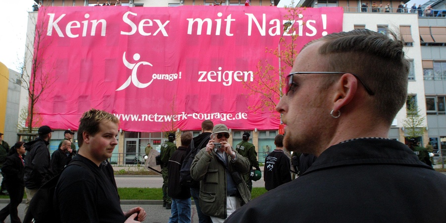 Am Rande eines NPD-Aufmarsches in Rostock wurde am DGB Haus ein Groplakat mit der Aufschrift "Kein Sex mit Nazis" angebracht.