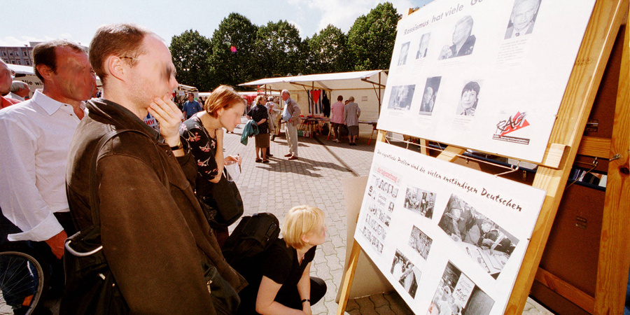 "Aktionstag gegen Rassismus und Neonazismus" in Berlin. BesucherInnen des Aktionstages betrachten eine Stellwand antirassistischer Gewerkschafter.