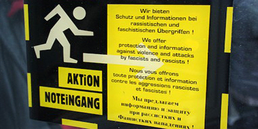Die Aktion Noteingang sorgte 1998/99 im Land Brandenburg für Furore. Sie wandte sich an Besitzer öffentlicher Einrichtungen und Räume, die unter anderem Aufkleber mit der Aufschrift»Wir bieten Schutz und Information bei rassistischen und faschistischen Übergriffen« anbringen sollten. Wir haben uns vorgewagt in die Höhle des Wolfes. In seine Konsumtempel, Einkaufsmeilen und Rathäuser, haben uns den Mund fusselig gequatscht über die Wichtigkeit von Zivilcourage, die Bedeutung von geschützten öffentlichen Räumen für von rechter Gewalt Betroffene und die Grenzzuweisung für Nazipack. Und - hat es was genützt? Wir meinen - ja. Ein Jahr Präsenz in den Medien, unzählige Diskussionen, die Begriffe wie Faschismus und Rassismus wieder ein Stück weit öffentlich hörbar machten - auch in der »Mitte der Gesellschaft«. Unsere Aktion war – wenn auch dezent - wahrnehmbar in den Stadtbildern.