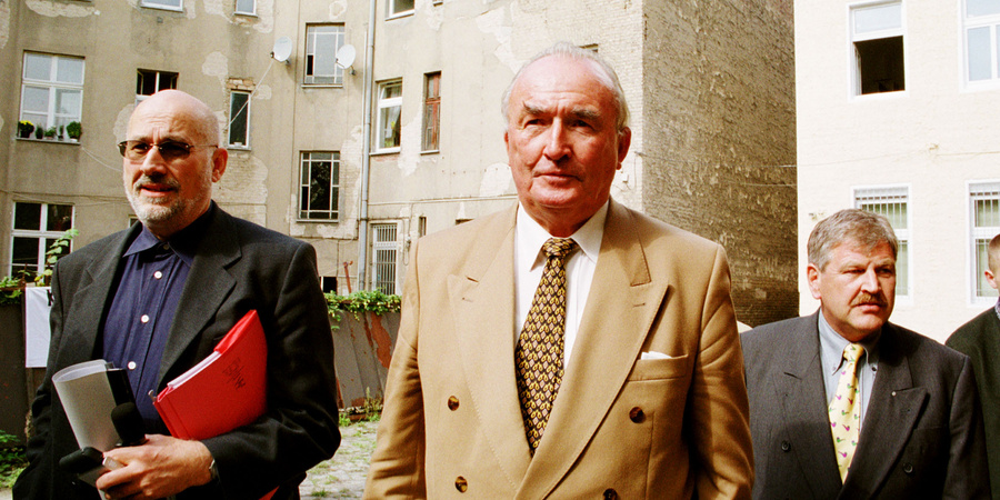 V.l.n.r. Horst Mahler, Franz Schönhuber und Udo Voigt bei einer Pressekonferenz "Ja zu Deutschland - Ja zur NPD" im September 2000.