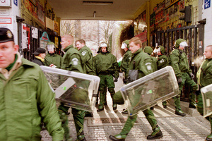 Eberswalde, 27. März 2001: Während rund 300 Neonazis durch die Kleinstadt marschieren, protestieren knapp 100 jugendliche Antifas am Straßenrand. Eine bekannte Situation entsteht: Eine Kette von Bereitschaftspolizisten stellt sich vor die linken Jugendlichen, die ohnmächtig Parolenrufen, als die Neonazis vorbeimarschieren. Eine Situation, die viele AIB-LeserInnen kennen. Doch dann ändert sich das Szenario schlagartig. Mit den Neonazis erreicht auch die Berliner Polizeieinheit »Politisch Motivierte Straßengewalt« (PMS), die die Berliner Kameradschafts-Aktivisten begleitet, die Straßenecke, an