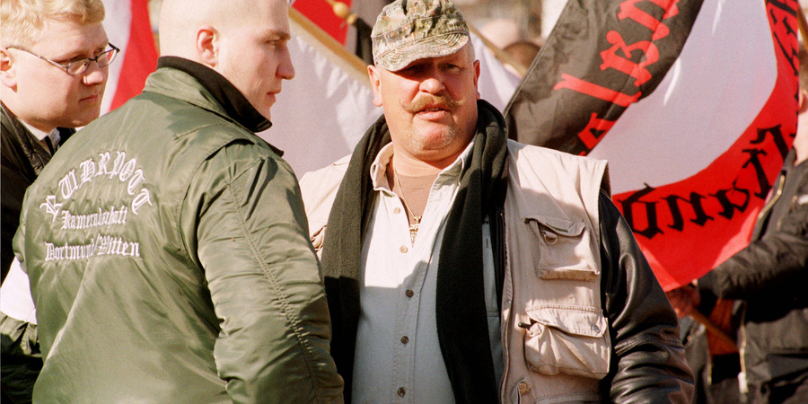 Rechts: Siegfried Borchardt, Spitzname SS-Siggi, aus Dortmund im Februar 1999 bei einer Neonazi Demonstration in Magdeburg