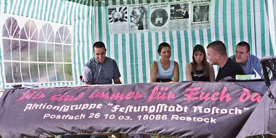 Enge Zusammenarbeit zwischen Kameradschaften und NPD. Hier die "Aktionsgruppe Festungsstadt Rostock" bei einem NPD-Pressefest in Rostock.