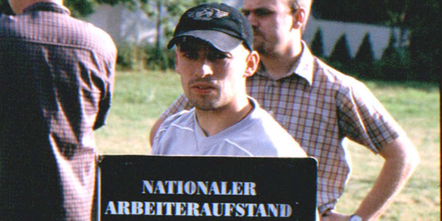Der Hallenser Neonazi Sven Liebich (am Schild) bei einer Demonstration am 17. Juni 2002 in Bitterfeld.