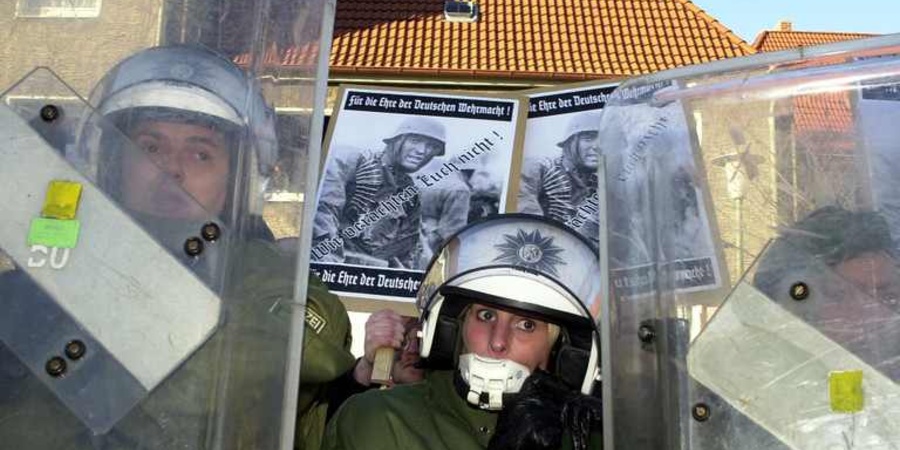 Rund 1400 Anhänger der NPD und Mitglieder sogenannter "Freier Kameradschaften" versammeln sich im Februar 2002 in Bielefeld, um gegen die dort stattfindende sog. Wehrmachtsausstellung zu demonstrieren.