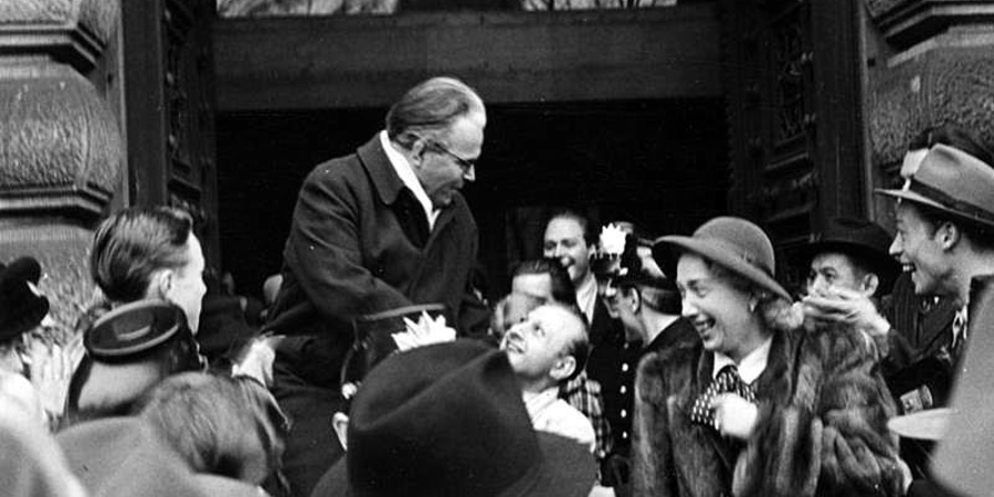 Veit Harlan verlässt nach seinem Freispruch auf den Schultern seiner Anhänger das Gerichtsgebäude.