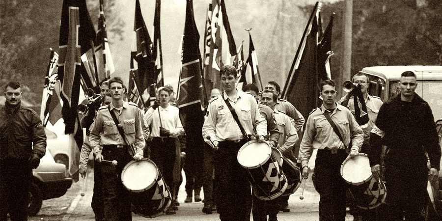 Neonazis marschieren am 17. November 1991 mit Fahnen und Trommeln auf den Friedhof in Halbe (Brandenburg).