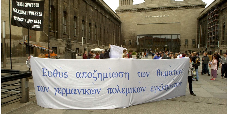 Mit Transparenten und Flugblättern vor dem Pergamonaltar erinnerte die »Initiative gegen das Vergessen« am 9. Juni 2002 im Berliner Pergamonmuseum an den Jahrestag des Massakers in dem griechischen Dorf Distomo durch Angehörige der SS. 218 Bewohner des Dorfes waren am 10. Juni 1944 von der 4. SS-Panzergrenadierdivision ermordet worden. Obwohl das höchste griechische Gericht den Überlebenden und Angehörigen der Opfer von Distomo rund 27,5 Millionen Euro Schadenersatz zusprach, weigert sich die Bundesregierung bis heute, eine Entschädigung zu zahlen. Während der deutschen Besatzung wurden 65.000 griechische Juden und Jüdinnen in osteuropäische Vernichtungslager deportiert.