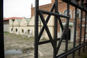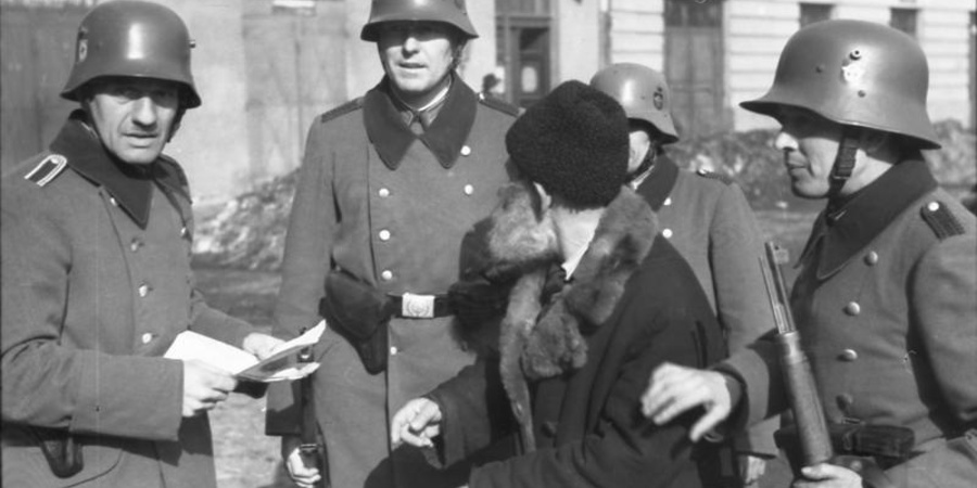 Deutsche Ordnungspolizisten führen eine Razzia gegen Juden in Krakau durch.