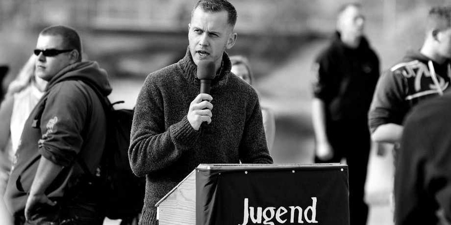 Sebastian Richter ("Sepp Hagen") als Redner auf einer Neonazi-Demonstration in Wismar im Oktober 2012.