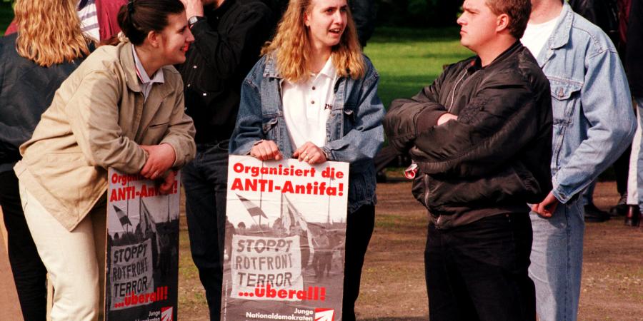 Propaganda für die "Anti-Antifa" auf einer NPD-Demonstration im Mai 1998 in Leipzig.