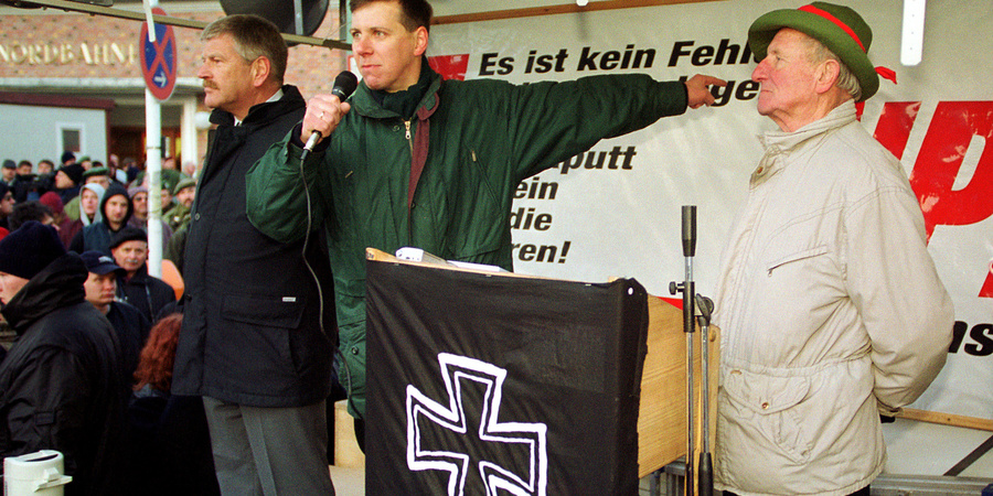 Wolfgang Nahrath (rechts) mit Jörg Hähnel (mitte) und Udo Voigt (links) bei einer NPD-Demonstration im Dezember 2001 in Berlin.