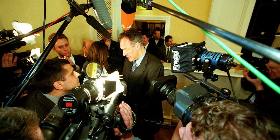 Der Bundesvorsitzende der rechtspopulistischen Partei "Partei Rechtsstaatlicher Offensive" (PRO) - "Schill-Partei"- Ronald Barnabas Schill belagert von Journalist_innen.