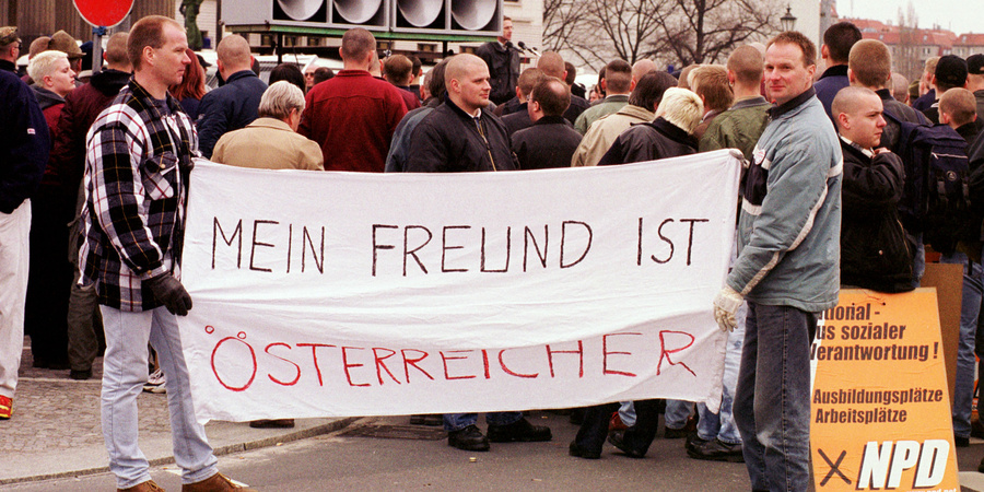 NPD Anhänger zeigen sich auf einer NPD-Demonstration im März 2000 in Berlin als Freunde Österreichs.