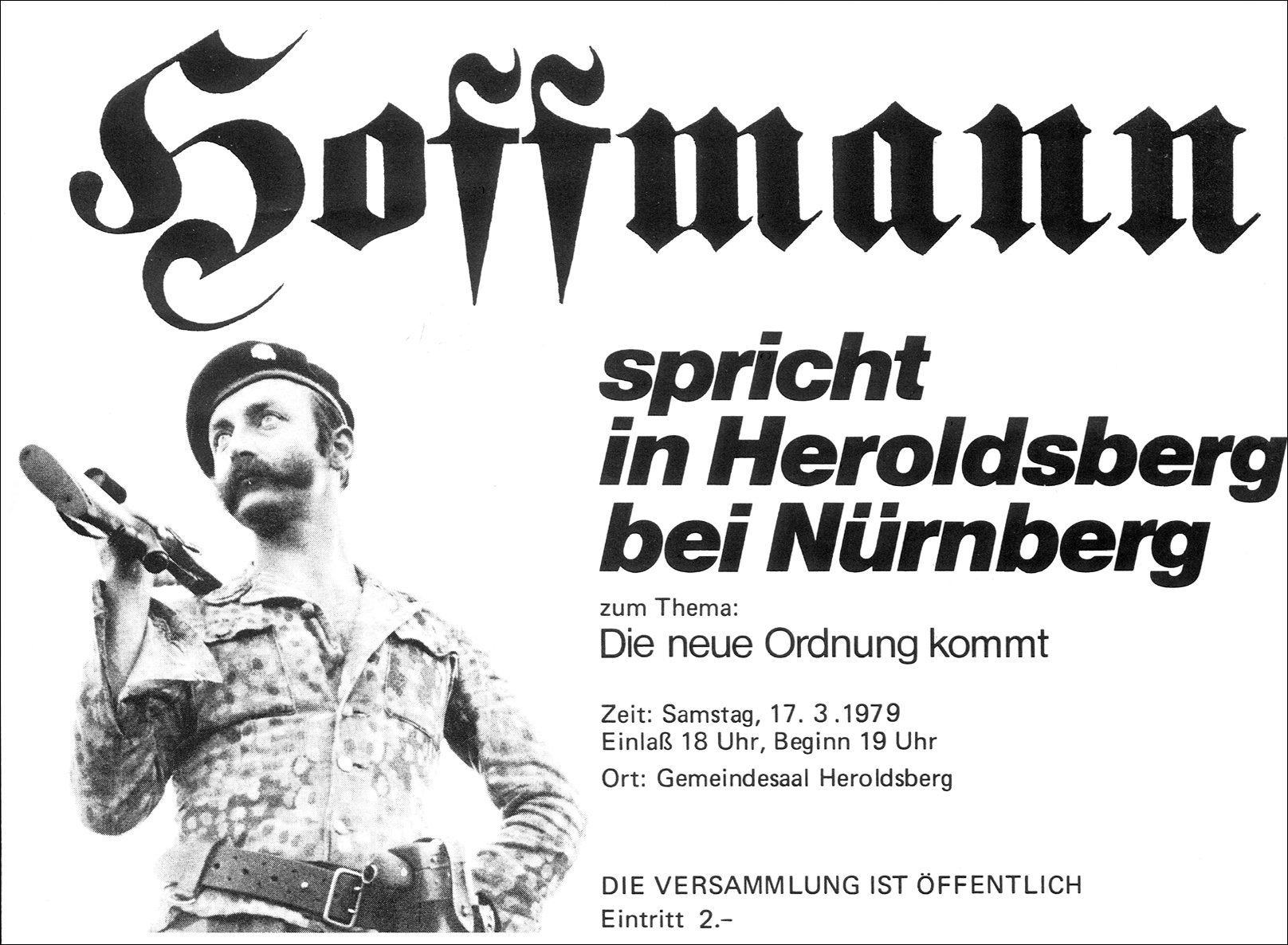 Die Vorgeschichte: Der 1937 in Nürnberg geborene Hoffmann, der schon 1963 in der Türkei wegen Waffenhandels verhaftet wurde, gründete 1973 die größte Wehrsportgruppe (WSG), die es in der Bundesrepublik je gab. Bis zu ihrem Verbot am 30. Januar 1980 sollen annähernd 500 militante Rechte auf das Kommando des fränkischen Militärfreaks gehört haben, viele der heutigen rechtsextremen Führungskader sollen bei Hoffmann in die militärische Lehre gegangen sein. Nach dem Verbot seiner WSG wurden bei Hausdurchsuchungen in drei Bundesländern 18 Lastwagenladungen voller Bajonette, Karabiner, Pistolen, Munition, Handgranaten, Stahlhelme etc. beschlagnahmt.