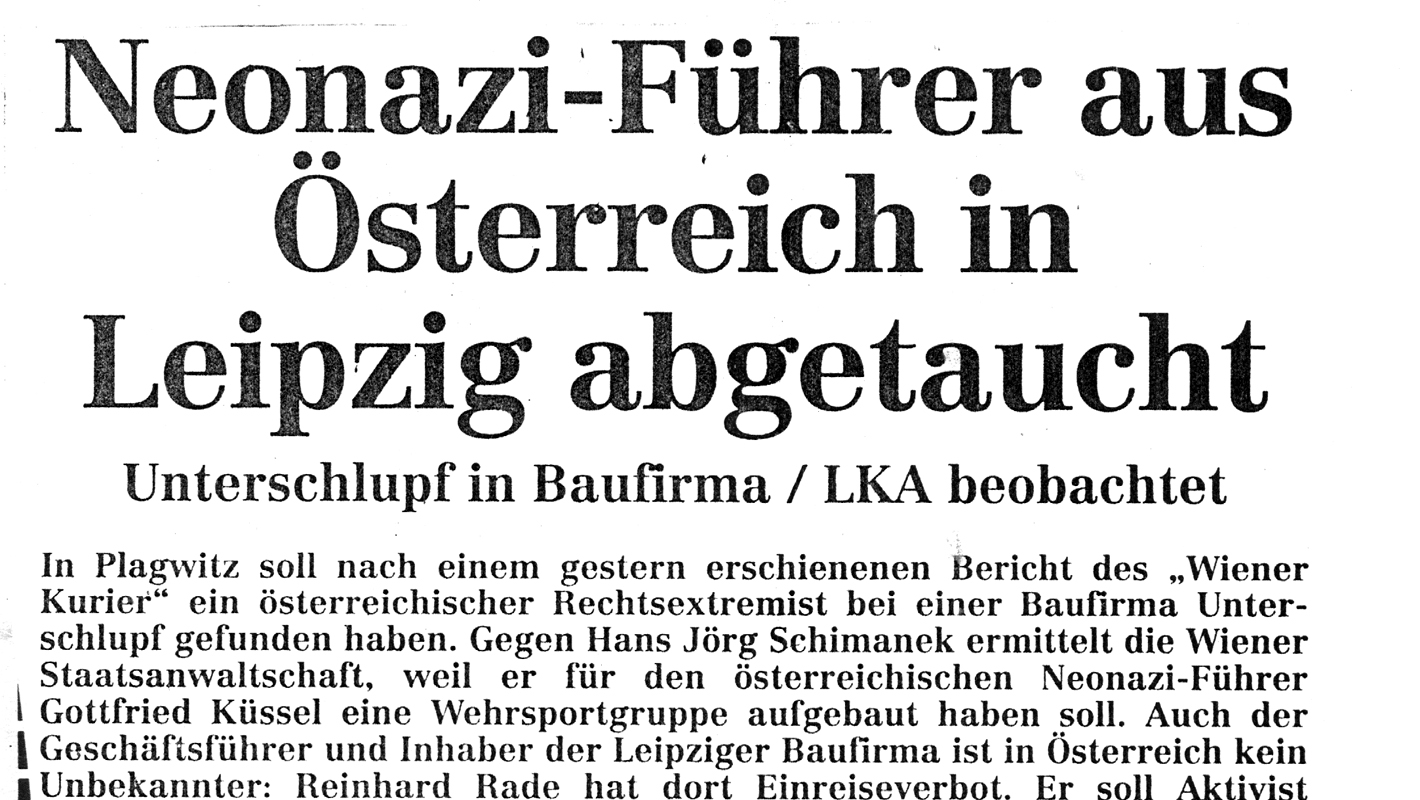Schon 1994 hatte er in dieser Firma Unterschlupf gefunden, deren Geschäftsführer Reinhard Rade da­mals war. Laut Handelsregisterakte war Schimanek (wie auch Rade) im März 1994 Gesellschafter der Leipziger Abbruchfirma Condor Projektentwicklung GmbH. Der dunkle Porsche, den Ex-Wehrsportgruppenchef Hoffmann seit Jahren fährt, »stammt aus dem Fuhrpark dieser Firma«. »Das Auto haben mir Bekannte zur Verfügung gestellt«, brüllte Hoffmann auf Nachfrage ins Telefon. Mit diesen Bekannten will er auch im Baubereich verkehrt haben.