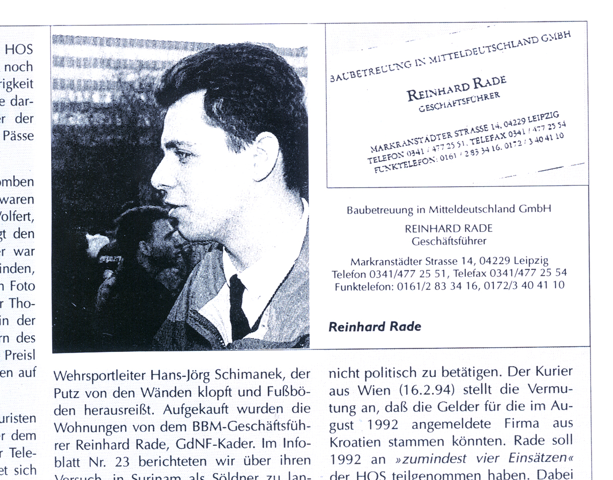 Die Rechtsextremisten von einst treten heute als scheinbar seriöse Geschäftsleute auf. Auf die Frage, ob Reinhard Rade und seine Freunde nicht eher den Aufbau einer modernen Söldneragentur planen, bricht der 39jährige in schallendes Gelächter aus. Doch die alten Kameraden kennen und schätzen sich und so manch lukratives Geschäft wird miteinander abgewickelt. Auch für Karl-Heinz Hoffmann geht es wieder aufwärts. Inzwischen ist er Geschäftsführer einer neugegründeten Baufirma in Kahla. Eine zweite Firma wurde im August beim Handelsregister in Gera eingetragen.