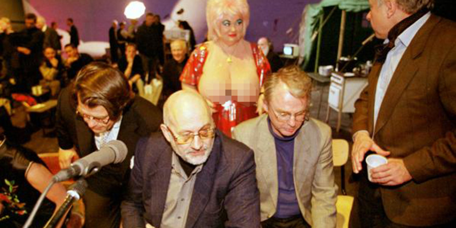 Jede Bühne ist ihm Recht – Horst Mahler (2.v.l.) und Prof. Michael Nier (2.v.r.) beim »2. Grossen Kameradschaftsabend mit Gästen aus Politik und Kultur«. In dem von Christoph Schlingensief 1999 an der Berliner Volksbühne inszenierten Stück diskutierten sie mit, laut Eigenbezeichnung, Berlins dickster Hure, Molly Luft.