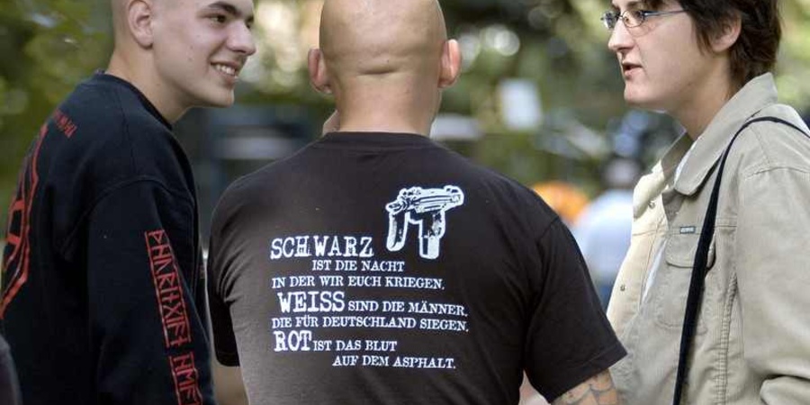 Neonazi-Skinhead in Gera im Juni 2003 bei einer NPD Veranstaltung. Auf dem T Shirt steht: "Schwarz ist die Nacht in der wir euch kriegen. Weiss sind die Männer, die für Deutschland siegen, Rot ist das Blut auf dem Asphalt."