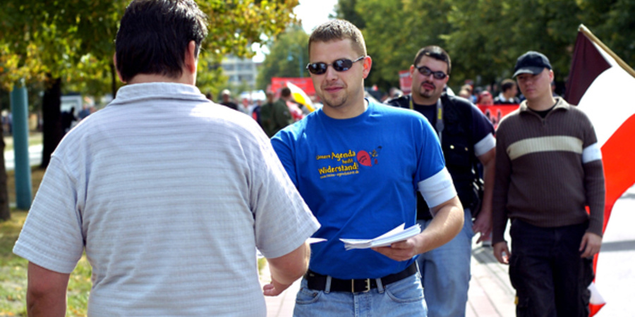 Hoyerswerda am 18.09.2004: Gordon Reinholz (Mitte), einer der Organisatoren des Neonazi-Aufmarsches gegen Hartz IV, verteilt Flugblätter an Passanten.