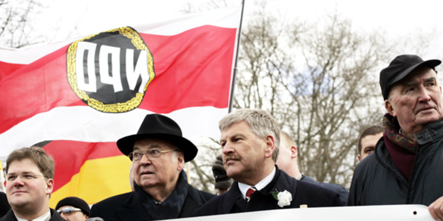 Auch am 13. Februar in Dresden: Holger Apfel, Gerhard Frey, Udo Voigt und Franz Schönhuber unter der Fahne der NPD