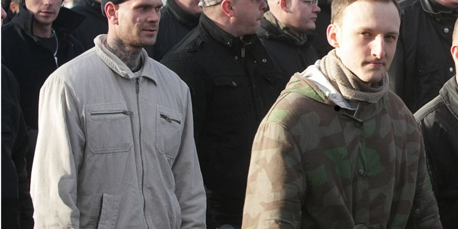 Der frühere "Freikorps"-Anführer Christopher Hartley (rechts) während eines Aufmarsches am 12. Januar 2013 in Magdeburg.