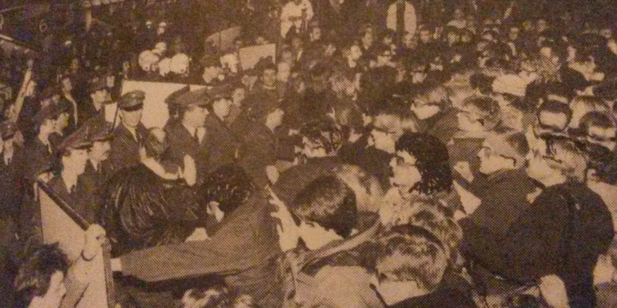 Als gegen 20.00 Uhr noch einige Zuspätkommer der REPs unten vorbeigelaufen waren blieb den linken Aktivisten die Frage: Was nun? Die SPD hatte inzwischen ihre Veranstaltung beendet. Hunderte BesucherInnen strömten die Treppe herunter, blieben aber nur teilweise stehen. Die Parolen gegen die REPs wurden wieder lauter. Die Gelegenheit für massiven Protest wäre günstig gewesen. Nur wenige Zivilbeamte der Polizei oder ICC-Ordner vor der Trennwand, alles voll Leute. Einige rückten näher an die Wand. Es wurde gedrängelt und geschoben, mehrere drückten von hinten nach und relativ schnell fielen die ersten Teile der Stellwand um. Die geringe Anzahl der Ordnungshüter war hilflos. Hinter der Wand hatten sich ein, zwei Reihen Uniformierter aufgestellt. Es entwickelte sich eine kurze Rangelei. Dabei wurden auch aktive REPs gesehen. Etwas mehr Nachdruck und der Weg zur REP-Veranstaltung wäre frei gewesen. Erst später kam ein Trupp behelmter Polizisten, der die Reihen der Polizei verstärkte.