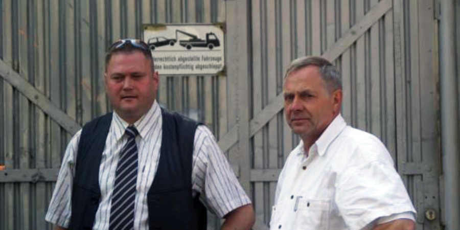 Die NPD-Funktionäre Eckart Bräuniger (links) und Manfred Börm (rechts) vor der Berliner NPD Zentrale.