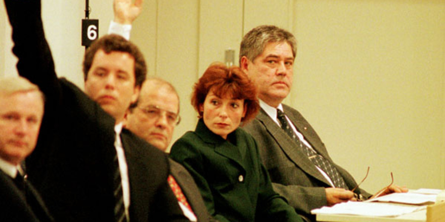Konstituierende Sitzung des im August 1999 neu gewählten Landtages in Potsdam. Die DVU-Abgeordnete Liane Hesselbarth (2.v.r.) und ihr Kollege Sigmar-Peter Schuldt (1.v.r.) enthalten sich einer Abstimmung.