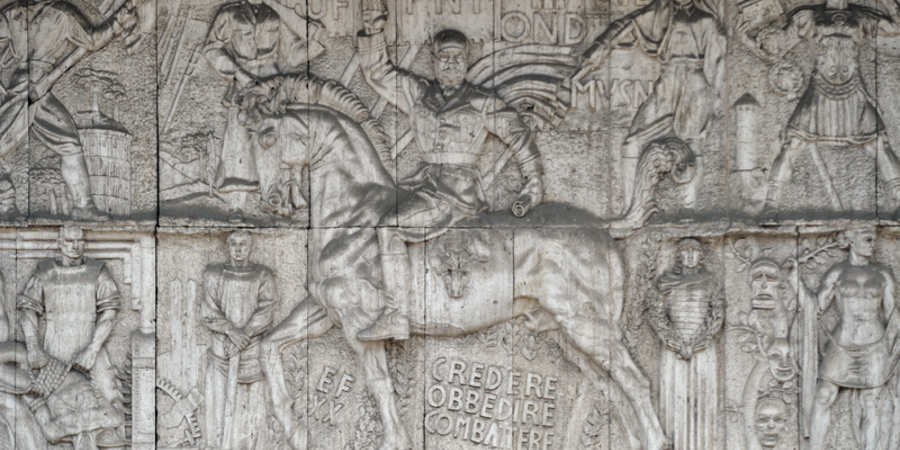 Mittelteil des faschistischen Mussolini-Reliefs am ehemaligen Haus des Faschismus in Bozen (Südtirol). Benito Mussolini hoch zu Ross und mit faschistischem Gruß.
