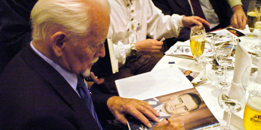 Hajo Herrmann signiert als ehmaliges Mitglied im NS-Luftwaffenführungsstab beim 50. Jahrestag der OdR ein Buch. Er ist oft als Redner auf NPD-Veranstaltungen und Neonaziaufmärschen aufgetreten.