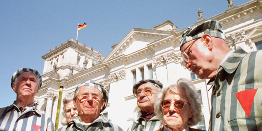 KZ-Überlebende fordern 1991 vor dem Reichstag die Entschädigung ehemaliger ZwangsarbeiterInnen.