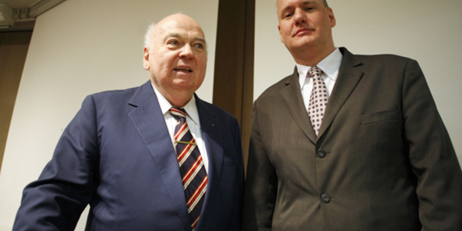 Der DVU-Bundesvorsitzende Gerhard Frey (links) und der Spitzenkandidat der DVU Hamburg Matthias Faust bei einer Wahlkampfveranstaltung im Congress Centrum Hamburg am 17. Februar 2008.